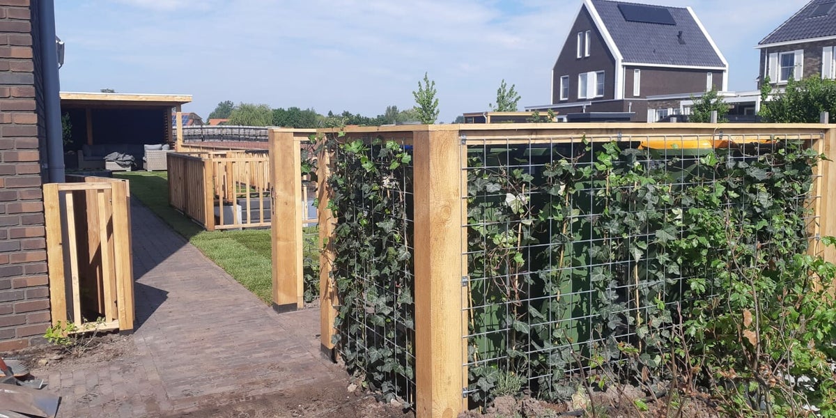 Schutting | keramische tegel | grind | verlichting | beregening | pergola | borders | beplanting